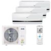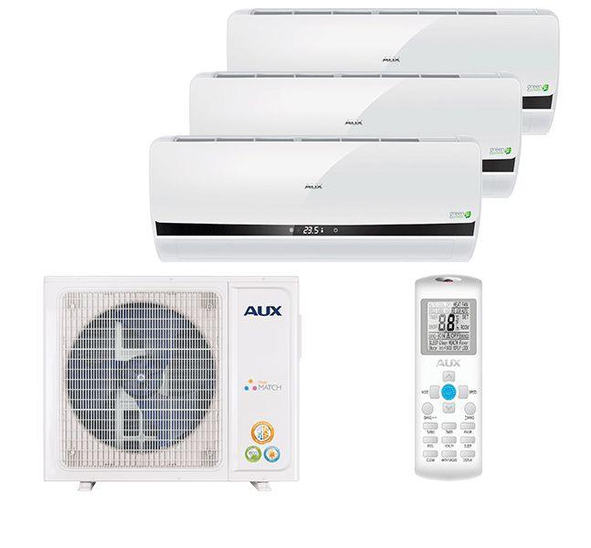 Описание AUX AMWM-H07/4R1 x 3 / AM3-H21/4DR1Для многих зданий очень важно сохранить внешний вид фасадов и избежать нагромождения его большим количеством наружных блоков. Именно для этого производители климатического оборудования спроектировали мульти сплит системы, которые дают возможность монтировать всего один наружный блок, а к нему уже подключать от 2 и более внутренних блоков различного типа и мощности.Представленная система применяется для обслуживания 3 помещений с общей квадратурой до 60 м2. Помимо популярных в быту настенных блоков, сплит система может быть укомплектована любым другим видом блока: канальным, кассетным или напольно-потолочным.Настенный блок AMWM-H07/4R1Модель устанавливается в комнатах до 20 м2. Имеет компактные формы и стильный внешний вид. Минимальная ширина блока составляет всего 19,8 см, что не усложняет инсталляцию в помещениях с ограниченным пространством. Лицевая сторона оснащена информационным LED дисплеем, на котором отображается текущее состояние системы и рабочая температура.Инверторные технологии;Высокий класс энергоэффективности А+;Комфортный уровень шума от 24 дБ;Управление с пульта;Диаметр дренажной трубы: 16 мм;Wi-Fi — опционально;Самодиагностика;Авторестарт.Внешний блок AUX AM3-H21/4DR1Встроенная шумоизоляция и усовершенствованный вентилятор с аэродинамическими свойствами позволили снизить уровень шума до комфортных пределов и уменьшить расходы на энергопотребление.Антикоррозийное покрытие теплообменника;Максимальное количество подключаемых внутренних блоков — 3 шт.;Возможность подключения блоков различного типа;Стабильная работа при низкой наружной температуре от -15 С на обогрев и -10 С в режиме охлаждения;Длина трубопровода до блока 30 м, перепад высот — 15 м, общая магистраль — 60 м.Огнебезопасный фреон R410A;Защита от замерзания, высокого и низкого давления, а так же от перегрузки компрессора.