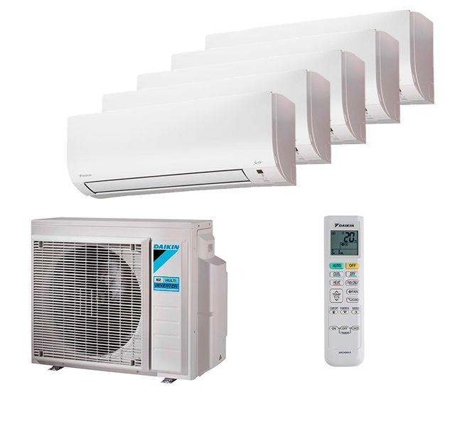 Описание Daikin ATXP20M x 5 / 5MXM90N9Мульти сплит система Daikin ATXP20M x 5 / 5MXM90N9 представляет собой комбинацию из 5 внутренних блоков ATXP20M мощностью 2 кВт и наружного блока 5MXM90N9 с производительностью 9 кВт в зависимости от режима работы. Данный комплект подойдет для пяти комнат с общей площадью до 100 м2.Внутренний блок ATXP20M отличается низким уровнем шума всего 19 дБ, многоуровневой системой фильтрации, качественными комплектующими чешского производства и утонченным дизайном корпуса. Для очистки воздуха используется титано-апатитовый фильтр и моющийся фильтр первичной очистки. Они эффективно улавливают не только мелкую бытовую пыль, но и препятствует размножению бактерий и устраняет неприятные запахи с улицы. Каждый из блоков имеет свой индивидуальный пульт управления. Внутренние блоки работают одновременно в одном режиме: на охлаждение или на обогрев.Наружный блок 5MXM90N9 оснащен качественный инверторным компрессором, который характеризуется высокими показателями энергоэффективности и низким уровнем шума. Имеет функцию Silent позволяющая дополнительно снизить шум на 3 дБ. Специальное покрытие теплообменника обеспечит надежную работу устройства и защитит детали от коррозии. Компактные габариты блока позволяют монтировать его вдоль наружной стены, на крыше или на террасе дома.Фукции и режимы:Независимое осушения для поддержания оптимальной влажности;Работа кондиционера по таймеру вкл./выкл.Удобный пульт в комплекте;Автоматическая и ручная регулировка скорости вентилятора;Автозапуск системы после сбоя в электросети;Автоматический режим работы на обогрев или охлаждение по данным окружающей температуры воздуха;Режим сниженного энергопотребления;Самодиагностика любых неполадок в работе устройства;Эффективное распределение воздушного потока для равномерного охлаждения/обогрева всего помещения;Комфортный ночной режим с низким уровнем шума и минимальными затратами на энергию;Возможность удаленного управления кондиционером при установке wi-fi контроллера — опция.Самодиагностика для быстрого нахождения ошибок в работе кондиционера;Функция теплого пуска исключит подачу холодного воздуха в начале работу системы.