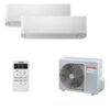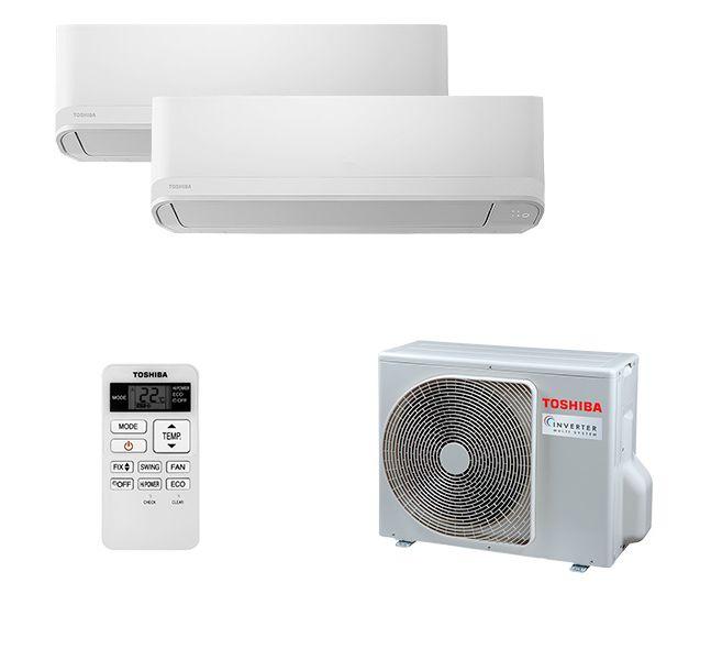 Описание Toshiba RAS-B05J2KVG-E x 2 / RAS-2M14U2AVG-EС помощью мультисплит системы Toshiba RAS-B05J2KVG-E x 2 / RAS-2M14U2AVG-E можно кондиционировать как многокомнатную квартиру, так и двух или трехэтажный частный дом. Наружный блок используется всего один, а сам комплект рассчитан на 2 комнаты общей площадью до 30 м2.Внутренний блок Toshiba RAS-B05J2KVG-EЭлегантный и стильный блок из модельного ряда Seiya, что в переводе с японского означает «Тихая ночь». Такое название линейка получила за одни из самых лучших характеристик шума, уровень которых составляет всего 19 дБа. Настенный блок используется в составе мульти сплит-системы и подключается к наружному блоку.Уникальное покрытие теплообменника Magic coilАвтоматическая функция самоочисткиВоздушный фильтр от пылиПлавная 7-ступенчатая регулировка скорости потокаЗащита от скачков напряженияАвторестарт после перебоев в сетиАвтоматический режим регулировки скоростиПульт управления в комплектеКачественная сборка — ТайландНаружный блок Toshiba RAS-2M14U2AVG-EШирокий выбор комбинаций, стабильная работа инверторного компрессора, возможность подключения блоков разного типа и экономия пространства при монтаже – все это идеально сочетается в наружном блоке мульти сплит-системы Тошиба. К одному такому блоку можно подключать до 2 внутренних, каждый из которых имеет свой пульт управления. Для работы оборудования используется фреон нового поколения R32, что говорит о полной безопасности и экономичности.Диапазон рабочих температур от -20 C на обогрев и от -10 C на охлаждениеМаксимальное число подключаемых блоков – 2Высокоэффективный DC-моторКомфортный уровень шумаОбщая длина магистрали до 30 метровБольшое количество комбинаций для установки